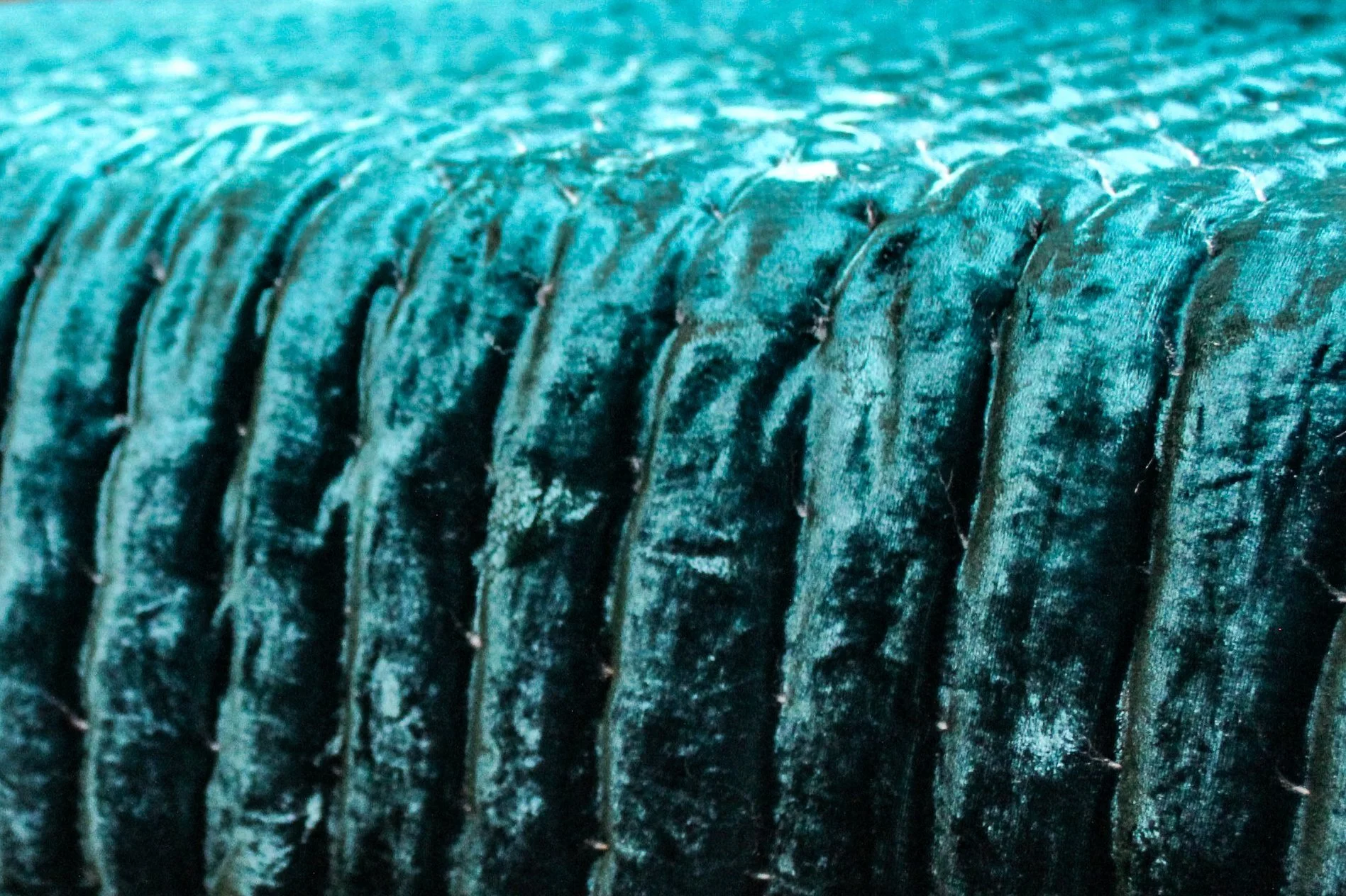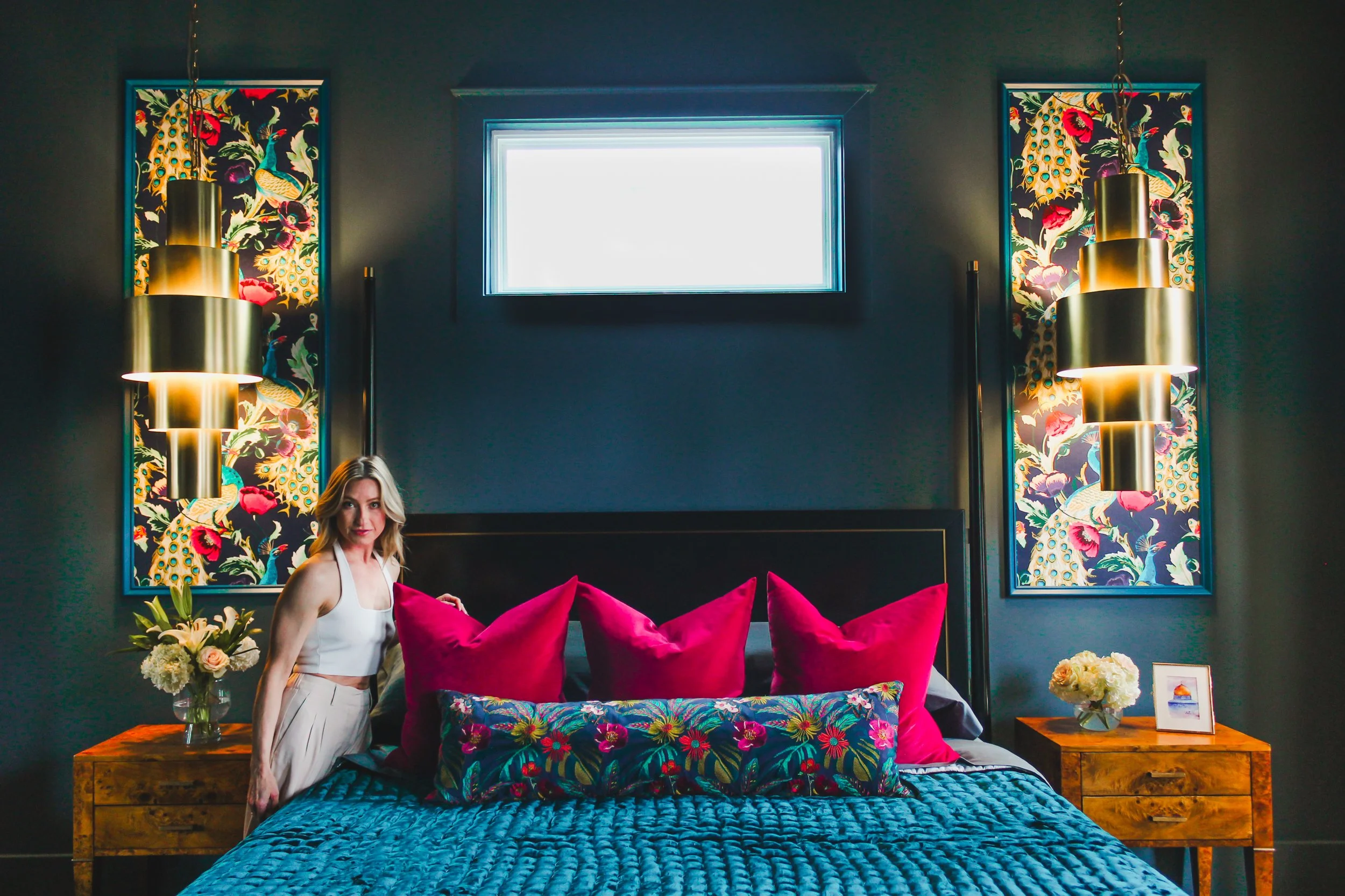 a sophisticated curation of bold jewel tones that saturate the Master bedroom, evoking feelings of mystery and sultry desires. The primary color is a deep teal, which, applied to all wall surfaces, serve as the backdrop to the additional jewel tones throughout the room.